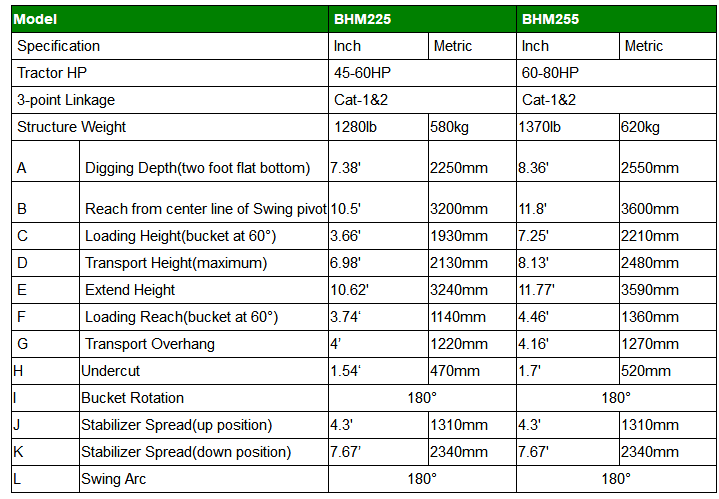 FHM offers BHM series backhoe attachments in four sizes to accommodate almost any category 1 or 2 tractor. Our FHM-BHM175 with a digging depth of 5’+ to our BHM8 with a digging depth of 8’+. The purchase of BHM5 backhoe attachments includes 12” wide bucket. Optional 9″ and 16″