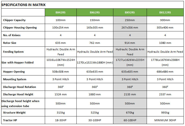 The BX-92RS is the bigger brother of the BX-62RS. Working with this unit is a true delight thanks to its hydraulic feed system. With this model, feeding and pushing etc. are a thing of the past; the 2 large feed rollers take care of this themselves. The speed of the feed rollers can be continuously adjusted. This is important so that the feed speed can be adjusted to fit the diameter of the material to be shredded. Smaller diameters can be fed faster than larger diameters. In the event that the feeder should become blocke,d the feed can be set into reverse using the large handle on the hopper. Furthermore, the feed can be switched off using this handle. The unit is powered via the tractor’s hydraulics; a pressurised supply line and an unpressurised return line are required or alternatively a double-acting control unit is required.