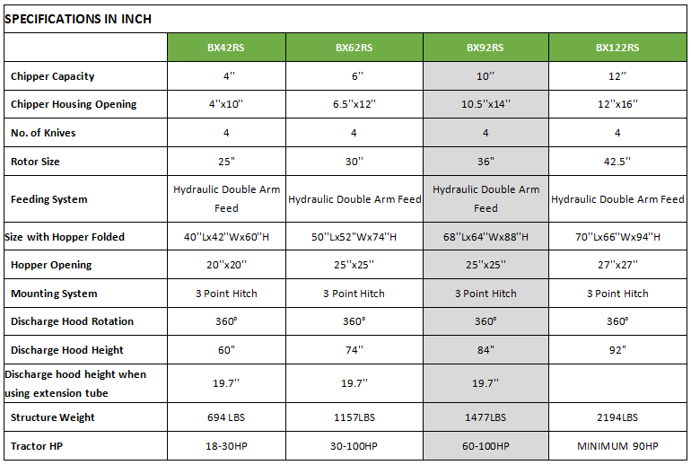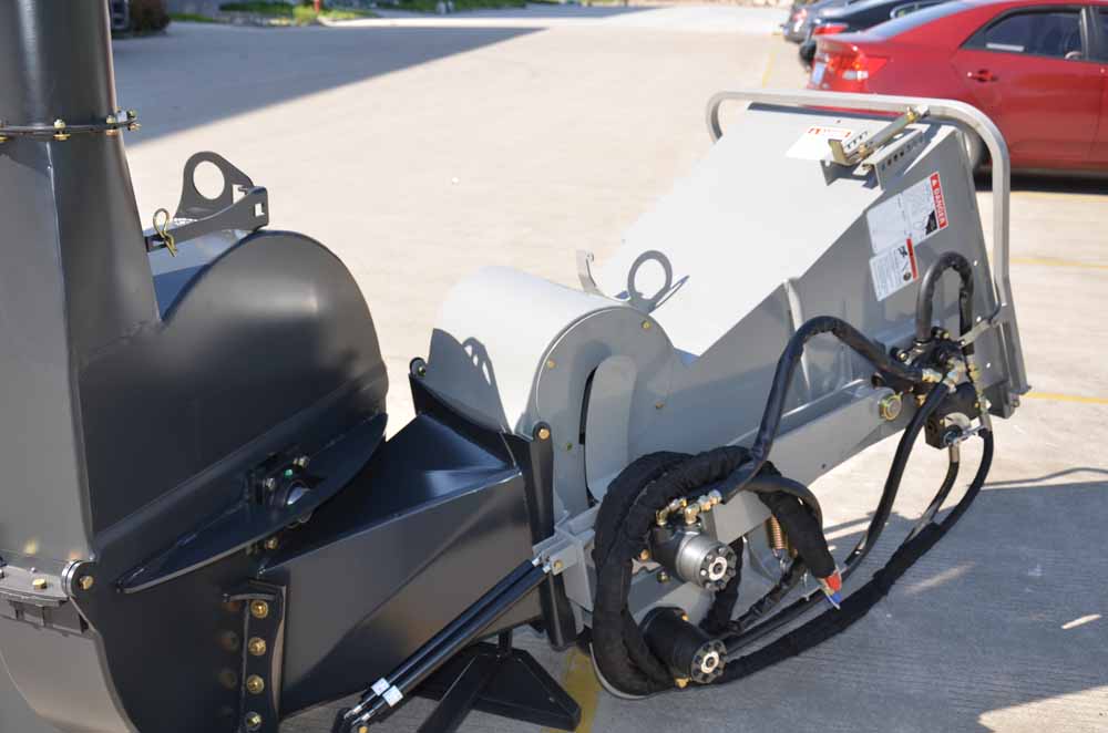 The feed hopper has an opening of 63.5 x 63.5 cm; at the bottom the opening measures 25.5 x 38. cm. A maximum diameter of 25.5 cm can be shredded. Many competitors list the maximum shredding diameter as the measurement of the bottom of the feed hopper, however, this value is unrealistic and can trigger the safety mechanism in the P.T.O. Softer woods with a width up to 38 cm can be shredde,d although such diameters are usually processed to firewood and not chipped.